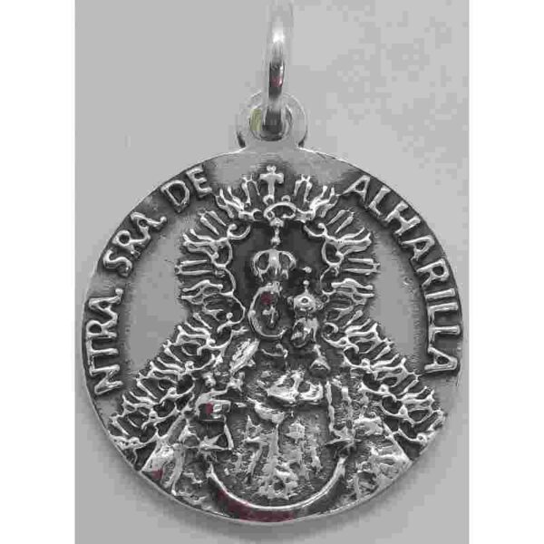 Medalla con imagen Virgen Alharilla en relieve de forma redonda de plata de ley de 925 mls con unas medidas aproximadas de 1,8 cm. La parte trasera lisa.